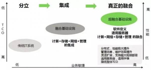 超融合基础架构(Hyper-Converged Infrastructure,或简称“HCI”)是指在同一套单元设备中不仅仅具备计算、网络、存储和服务器虚拟化等资源和技术,而且还包括备份软件、快照技术、重复数据删除、在线数据压缩等元素,而多套单元设备可以通过网络聚合起来,实现模块化的无缝横向扩展(scale-out),形成统一的资源池。超融合(甚至超超融合)在本地很容易实现:将计算、网络和存储都集成在一个设备内,并且通过它由供应商预先配置好且差不多到手就可以使用。